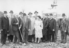 Plymouth, Indiana April 13, 1963 was the turning of the first shovel of dirt at the ground breaking ceremony for Bomarko, Inc. Those pictured are Robert M. Koch corporation president and Walter Glaub, president of the Plymouth Industrial Development Corp. The ceremony was held at the site on Oak Road in Plymouth. Pictured are left to right, Fred Morrow, Ed Miller, legal counsel for Hollymatic, Inc., Koch, John Nickoloff, Glaub, George Holly, Mayor Bixel, Mrs. Koch, Joe Felke, Art Thomson, Francis Johnson, Clayton Robinsin and Harry Holly. Robert Koch, president of Bomarko, Inc., facing front center, shows how paper is waxed at the new plant recently constructed on an 11-acre site on Oak Road adjacent to the old Nickel Plate railroad. Koch conducted a tour for fellow members of the Plymouth Rotary club on August 20, 1963.